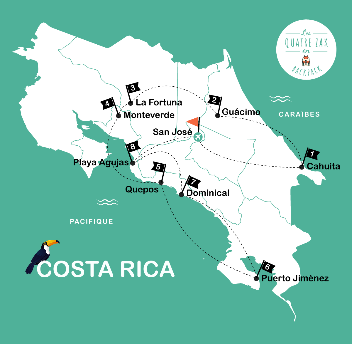 Nous sommes restés un peu plus de 5 semaines au Costa Rica. Voici les différentes étapes de notre itinéraire.