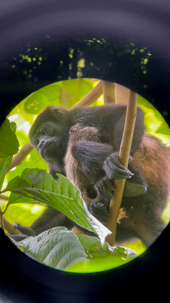 Notre guide prénommé Geiner, naturaliste de formation, est un passionné et un très bon pédagogue. On ressent l'amour qu'il a pour son pays, son histoire, sa faune et sa flore. En voyant les enfants s'intéresser à une grenouille sur le chemin, il n'hésitera pas à interrompre les explications sur le cacao, pour nous parler de cet animal ou même à aller chercher sa longue-vue pour observer de plus près une famille de singes hurleurs qui passait par là. Il nous fait d'ailleurs remarquer que lorsqu'il était enfant, il pouvait voir des troupes de 25 à 30 de ces singes se déplacer ensemble. Désormais, ce sont plutôt des groupes de 8 à 10 individus pas plus.