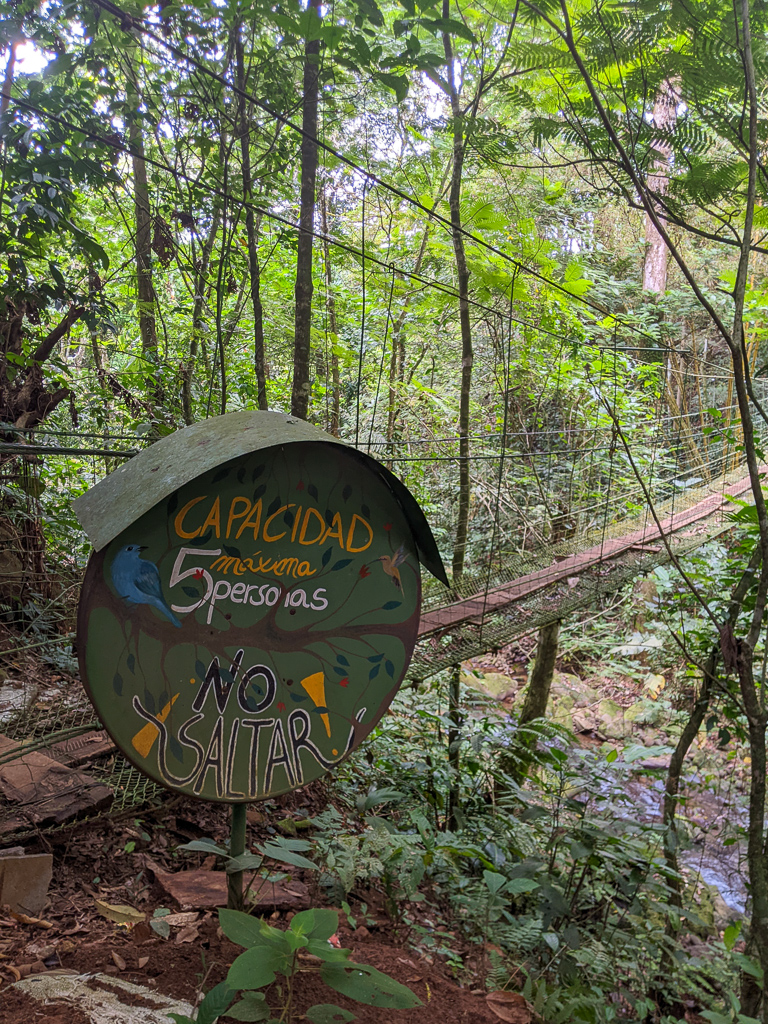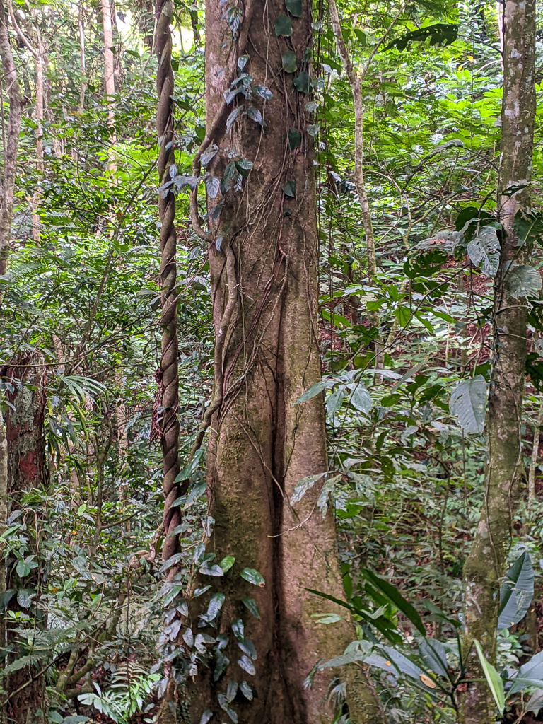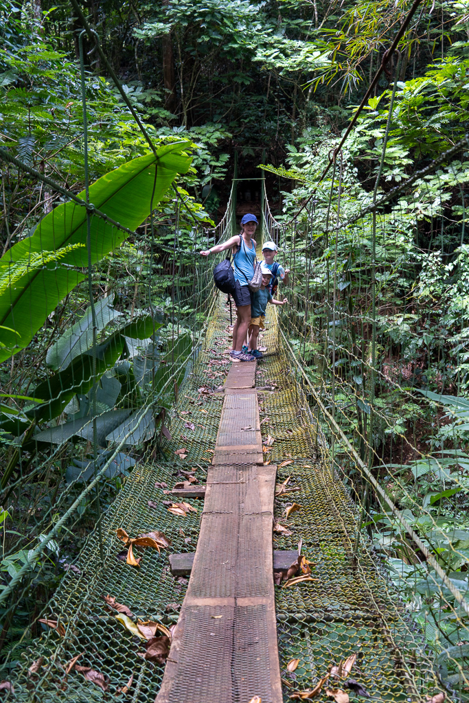 Nous avons fait une chouette balade menant à une cascade. Le chemin passe à travers une forêt aux arbres improbables et dans laquelle vivent des animaux colorés. Le peu de monde croisé ainsi que la traversée d'un pont suspendu nous met dans la peau de vrais aventuriers. Les enfants sont ravis et carburent à toute allure. Pierre-Yves et moi avons du mal à les suivre (il faut dire qu'il fait très chaud et humide).