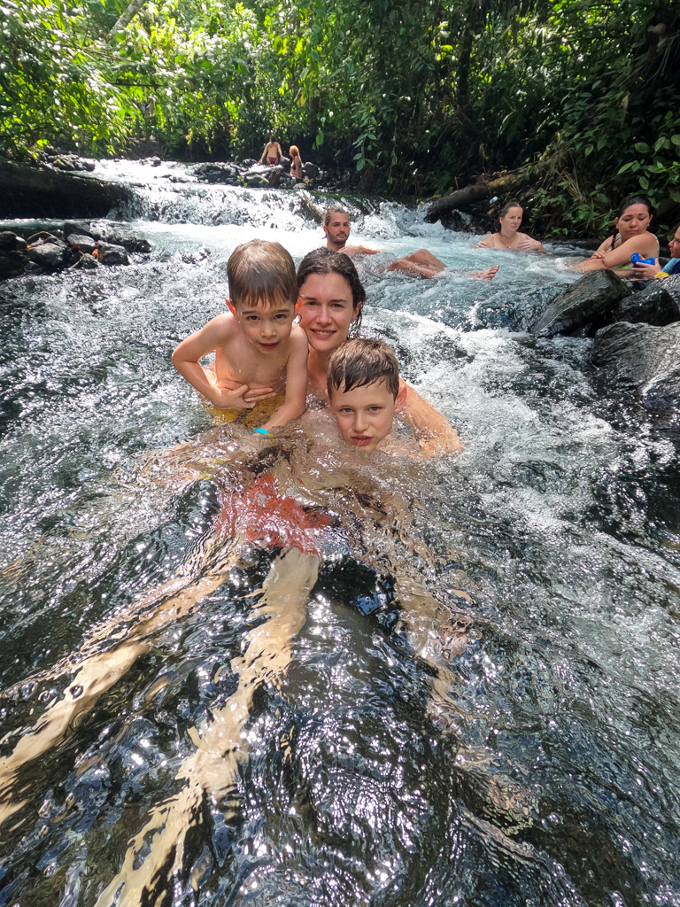 De nombreuses sources chaudes jaillissent du sous-sol du volcan, chauffées par géothermie. Ces eaux chaudes auraient des vertus thérapeutiques. Nous avons donc profité d'un accès gratuit pour tester leurs bienfaits. Nous y avons barboté pendant 2h, un moment agréable et relaxant (même les enfants paraissaient détendus).