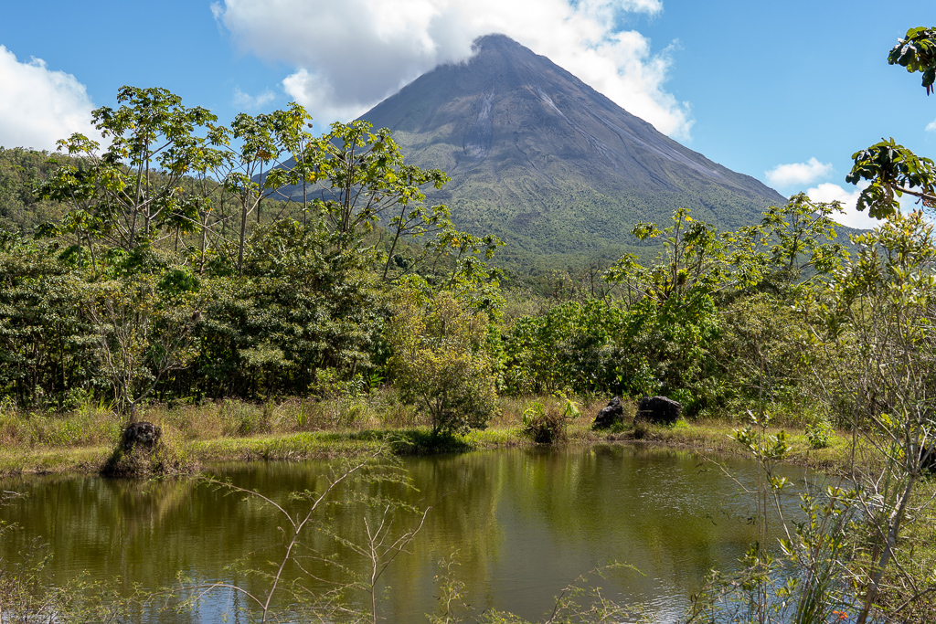 Le volcan Arenal culmine à 1663 mètres au-dessus de la mer. Il est toujours actif et se réveille régulièrement, mais la dernière fois que son éruption fit de réels dégâts remonte à 1968. En raison de sa situation géographique, entre les influences de l'Atlantique et du Pacifique, il est très souvent couvert (totalement ou partiellement) d'une auréole de nuages.