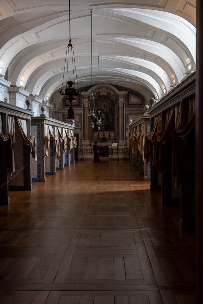 Derrière cet édifice à la façade impressionnante, se cachent les anciens appartements de la famille royale, ainsi qu'un ancien monastère, une basilique et une bibliothèque refermant plus de 36 000 livres anciens. Nous apprenons lors de notre visite qu'une colonie de chauve-souris y loge. Leur rôle est de manger les petits insectes qui pourraient ronger le papier des livres et ainsi les détériorer.