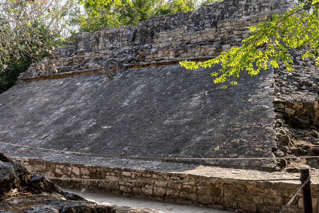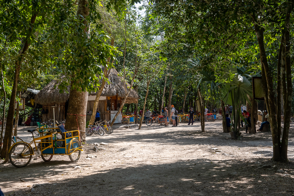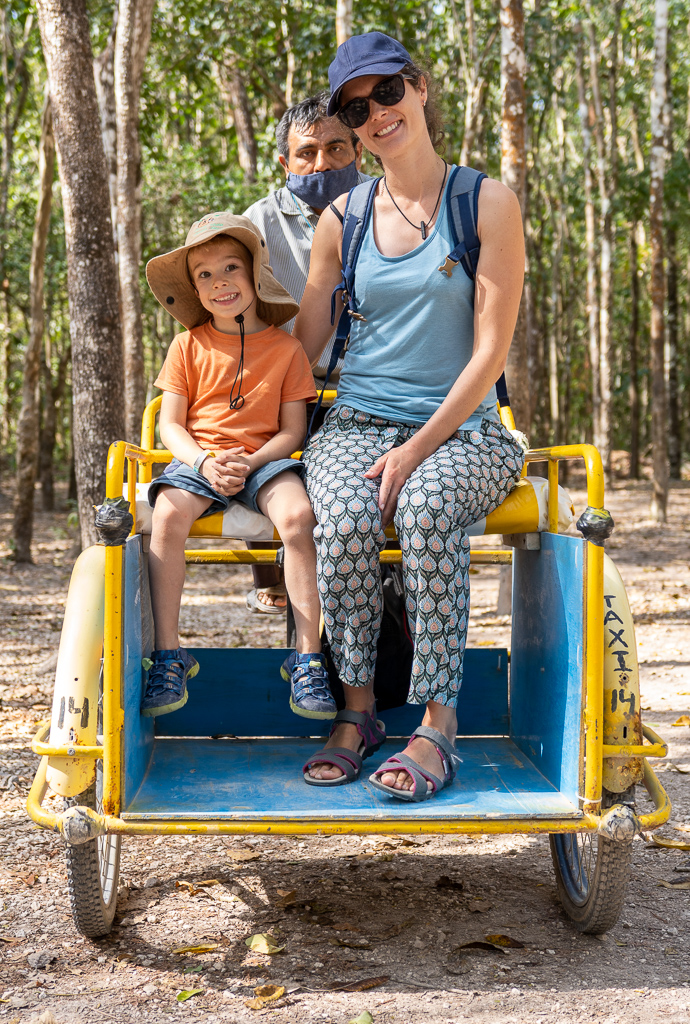 Puis on passe à la partie ludique de la visite. Nous louons deux vélos et un pousse-pousse pour découvrir des vestiges se trouvant un peu loin dans la forêt à savoir notamment la pyramide la plus haute de l'Etat (la deuxième plus haute du Yucatán) et un terrain de jeu de balle qui servait non pas pour se distraire mais pour choisir une personne à sacrifier.