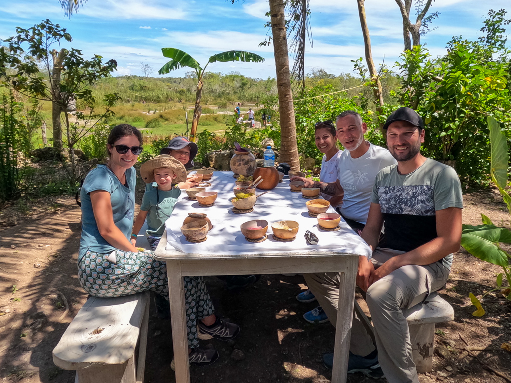 Nous partons avec Muriel, notre guide à la rencontre d'une famille maya. C'est proche de la réserve de Punta Laguna (à 1h de Tulum) que nous découvrons, au sein d'une forêt, quelques habitations en bois. C'est ici que vit une famille maya sur trois générations. Ils vivent ici sans électricité. Nous sommes accueillis très chaleureusement par plusieurs membres de la famille.