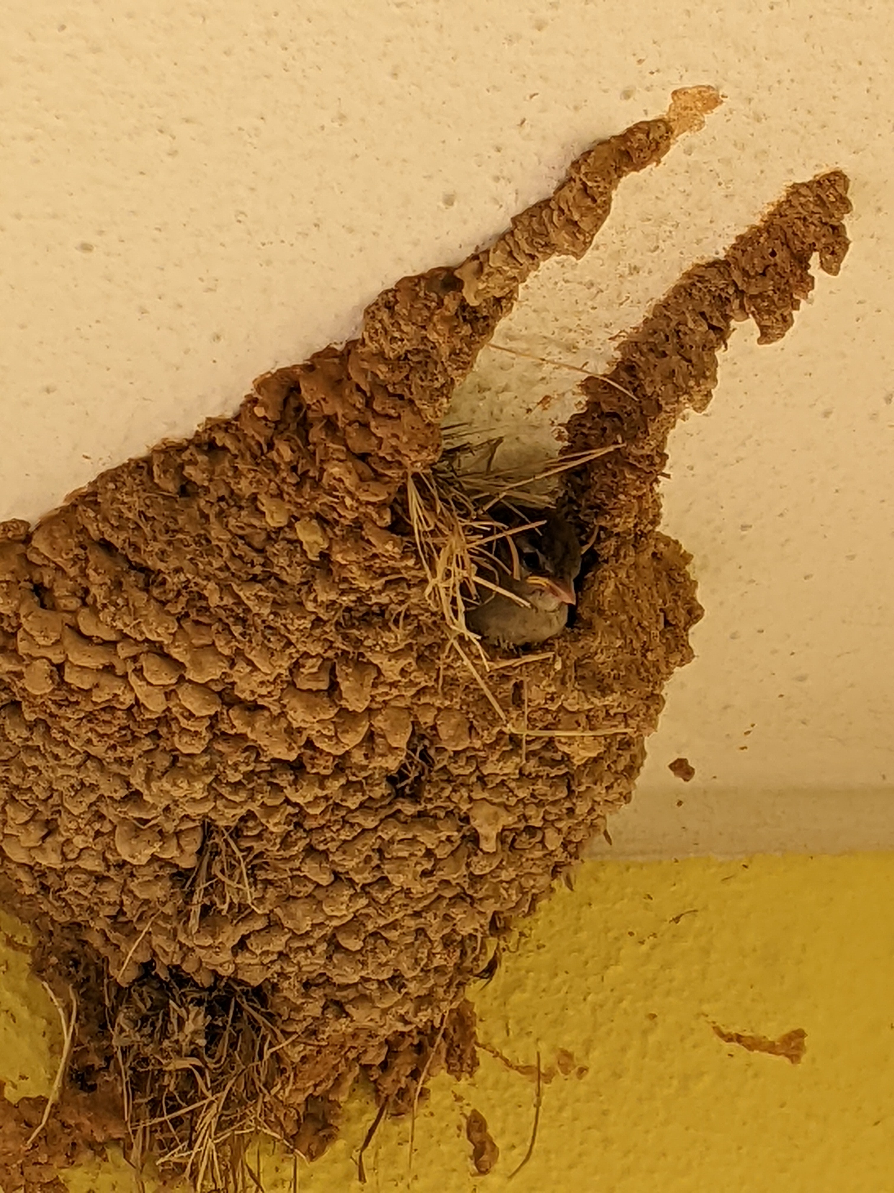 Nous avons eu la chance de voir deux oisillons qui étaient sur notre terrasse dans une de nos maisons en Algarve. Ces moineaux construisent généralement leur nid mais ils peuvent également occuper le nid d'hirondelles qui se sont absentées, comme cela était le cas ici.