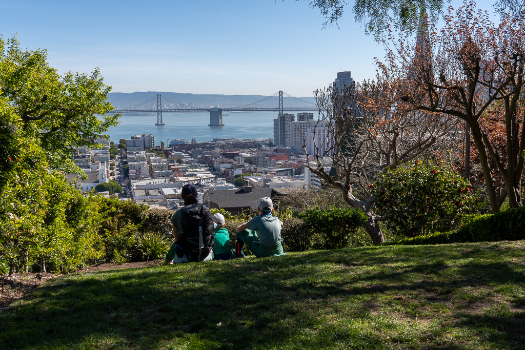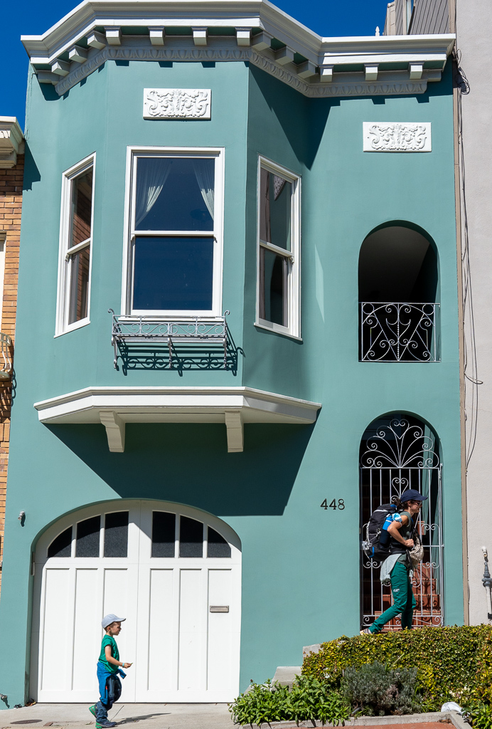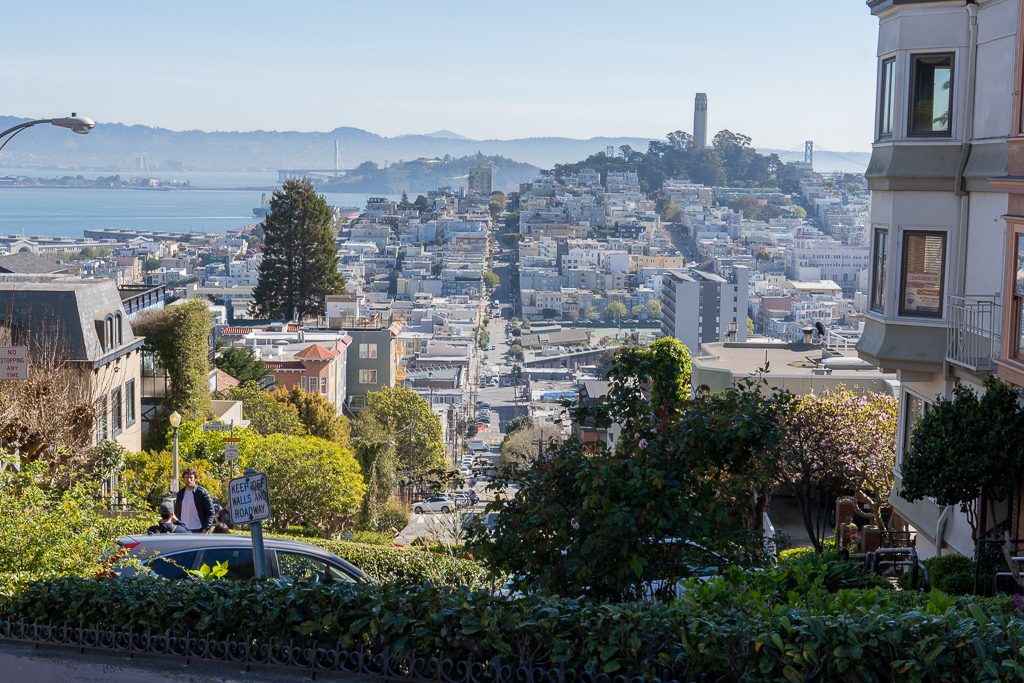 Nous arrivons tout en haut de Lombard street , rue la plus tortueuse. Nous la descendons à pied puis nous repartons à l'ascension des rues voisines pour arriver au point culminant de Russian hill , pour avoir un joli panorama sur le nord et l'ouest de la ville. On apprécie la balade dans ce quartier résidentiel. C'est calme, il y a peu de monde.