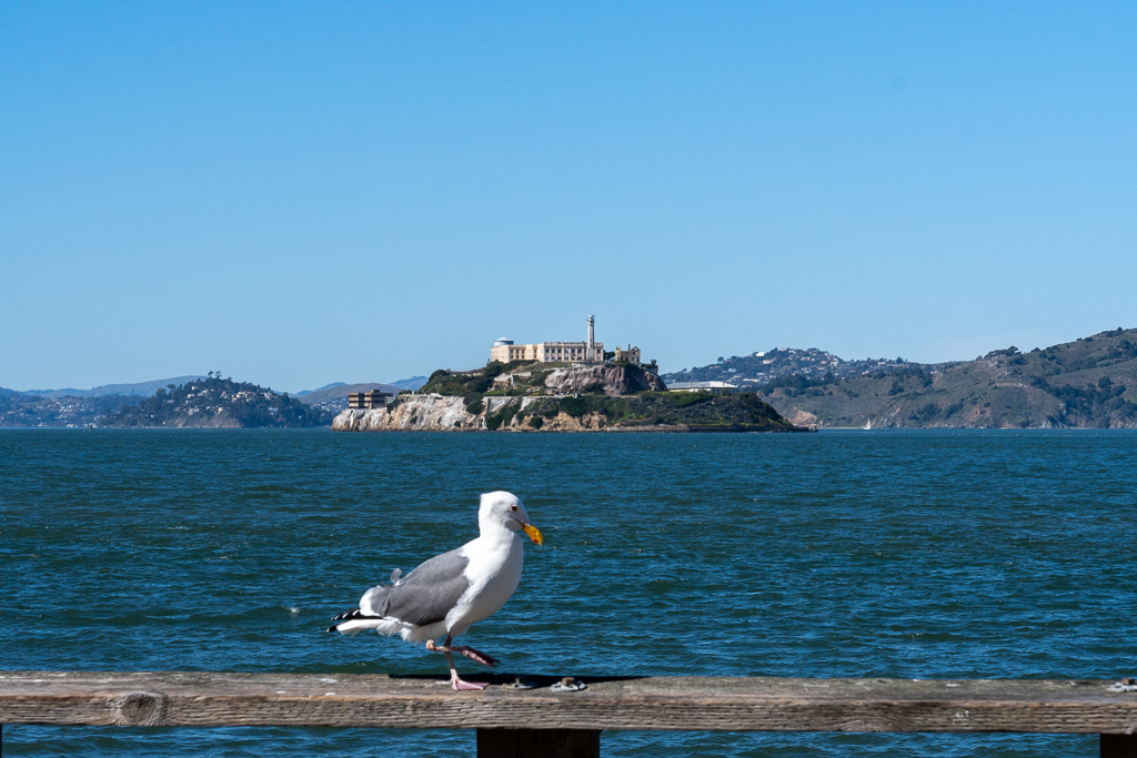 Nous commençons par le Fisherman's wharf (ancien quartier des pêcheurs et des conserveries réhabilité) et son Pier 39 : jetée avançant dans la mer composée de maisonnettes de bois, c'est un centre commercial à ciel ouvert, mais encore endormi à 9h du matin. Nous admirons la vue sur la baie et notamment sur l'île d' Alcatraz , ainsi que des lions de mer prenant un bain de soleil.