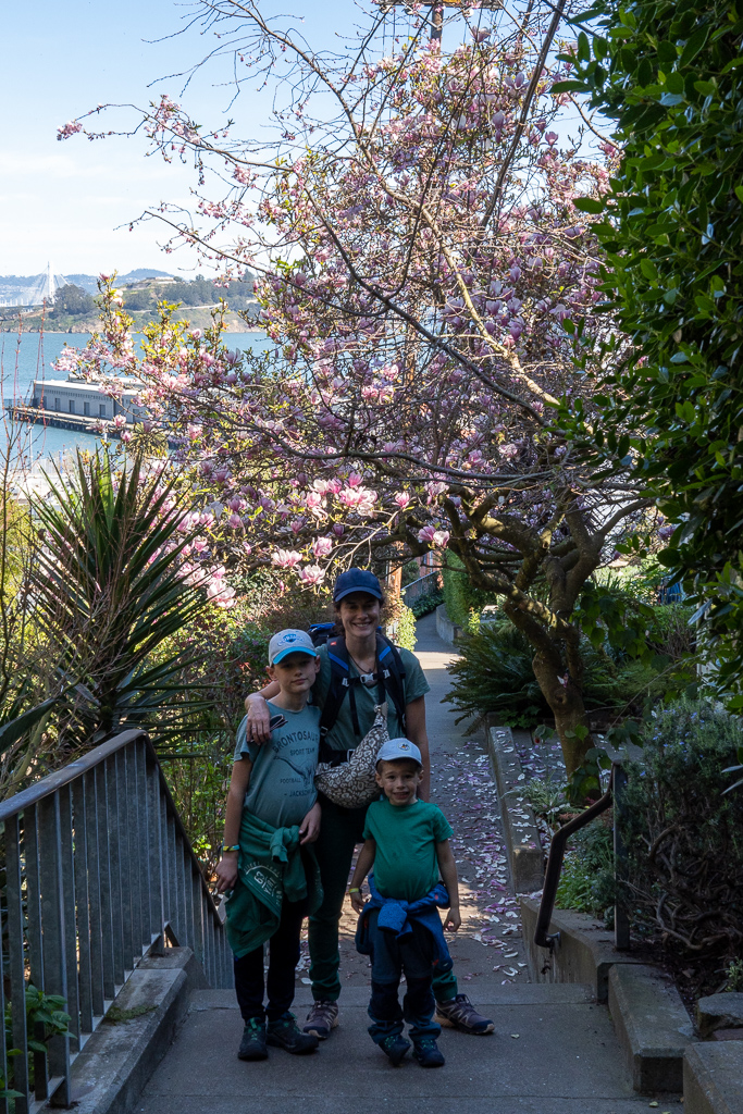 Puis on redescend vers notre point de départ en empruntant plusieurs séries d'escaliers en bois: les Filbert steps . Nous passons entre de petites maisons en bois entourées de beaux jardins arborés et fleuris (un petit village au sein de la ville animée).